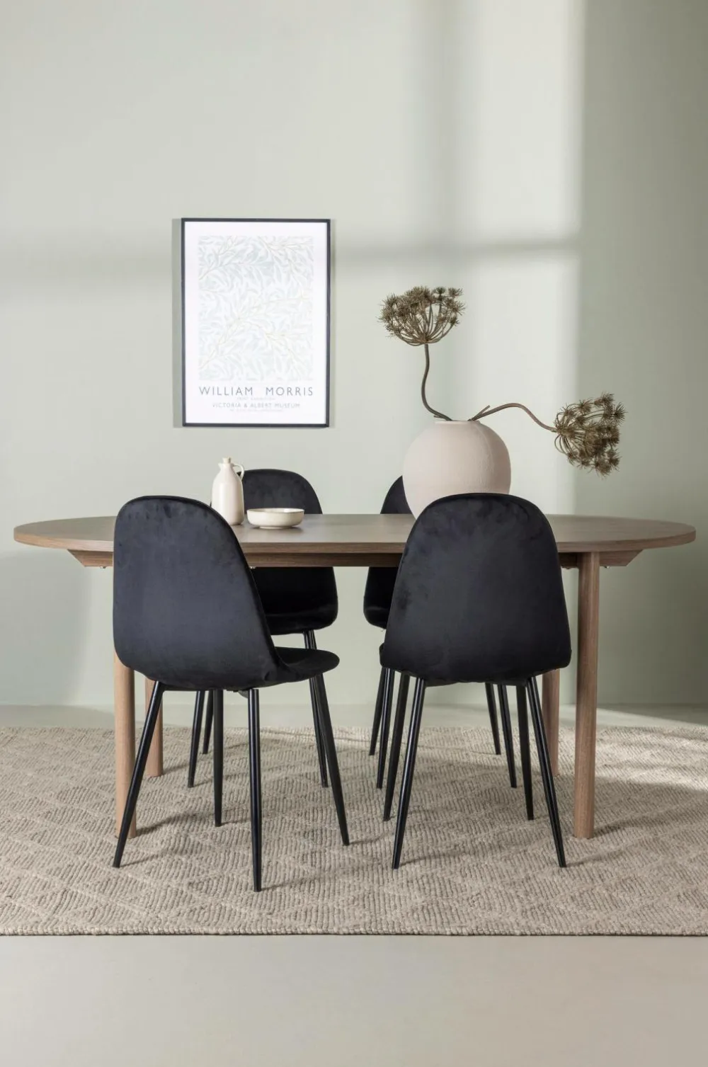 polar Stolene supplerer bordet perfekt med deres fuldpolstrede sæde i sort polyesterfløjl og sorte stålben. Deres skandinaviske design tilføjer et iøjnefaldende og elegant touch til din spisestue, samtidig med at de tilbyder komfortable siddepladser under lange middage.