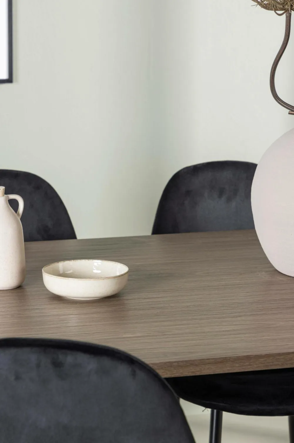Dette spisebordssæt indeholder fire stole, hvilket gør det ideelt til mindre sammenkomster og familiemiddage. Med sit skandinaviske design og markante udseende bliver dette ensemble en elegant indretningsdetalje, der løfter atmosfæren i hele rummet. Perfekt til at skabe et stilfuldt og indbydende spisestuemiljø.