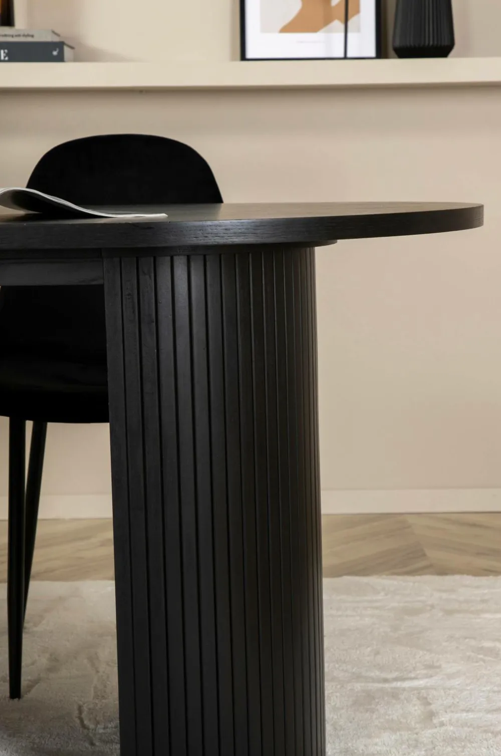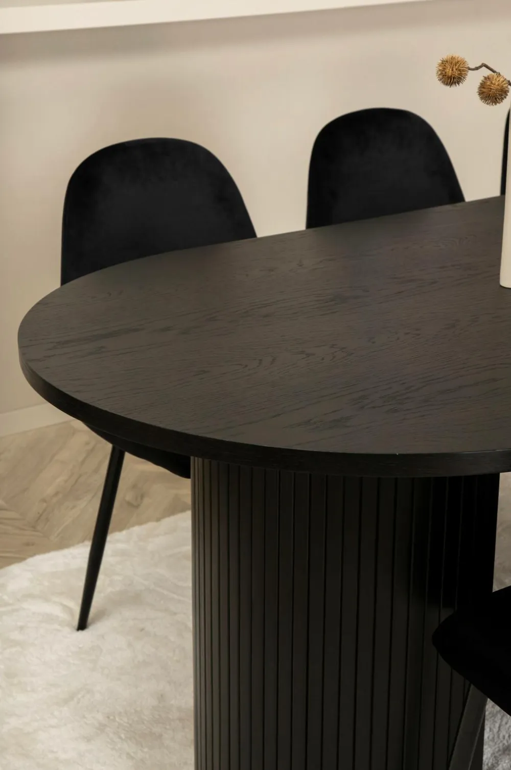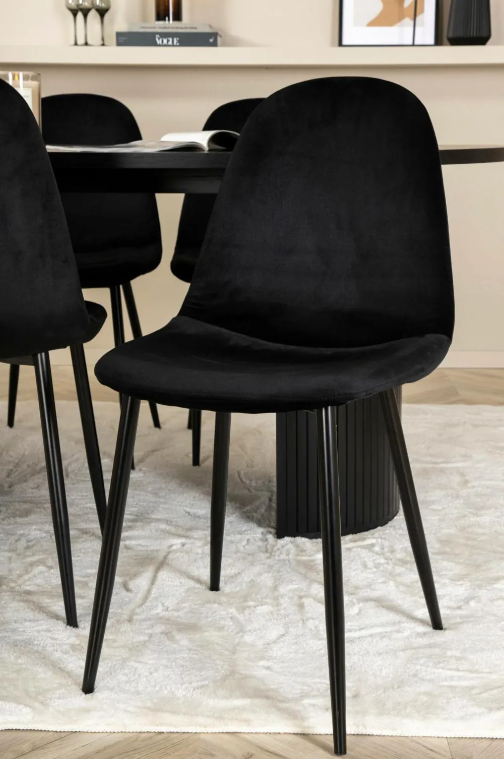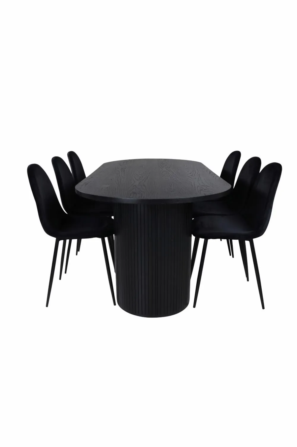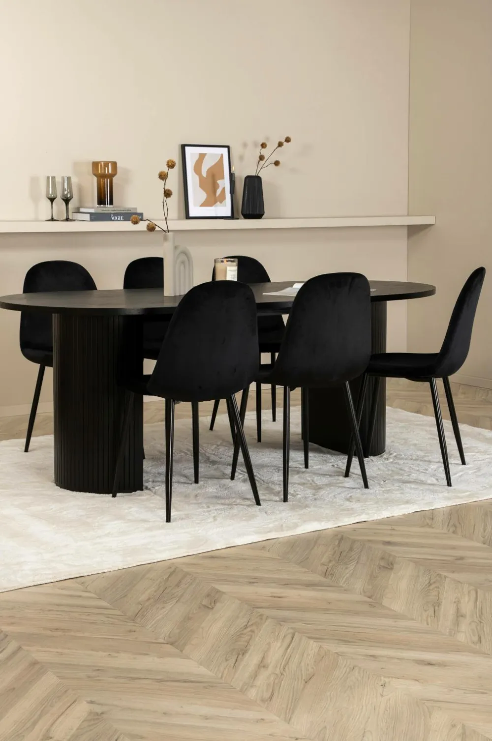 Bianca spisebord med oval bordplade i MDF med finér og bordben i træ og MDF. Matches med 6 Polar spisebordsstole med sæde i velour og stoleben i metal. Bord og stole kræver let montering. Bordets mål: Længde: 200 cm, bredde: 90 cm, højde: 75 cm. Stolenes mål: Siddedybde: 39 cm, Siddebredde: 44 cm, Siddehøjde: 41,5 cm.