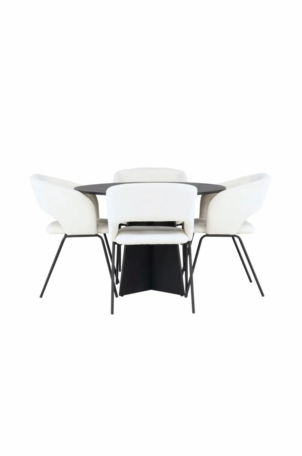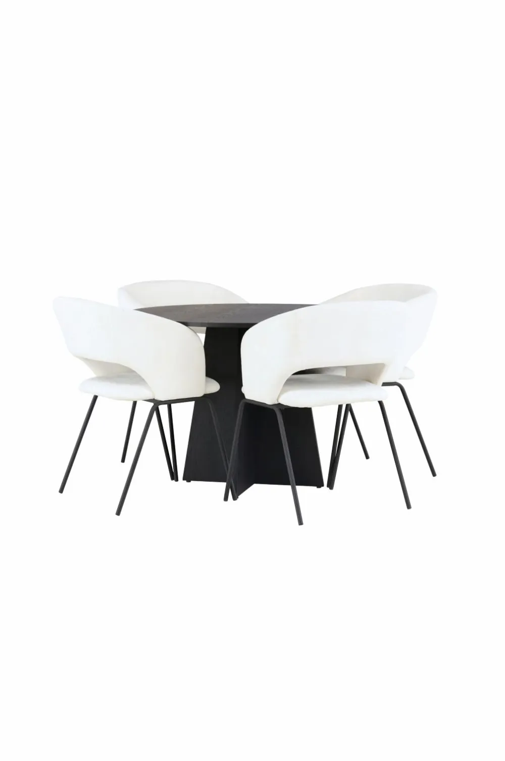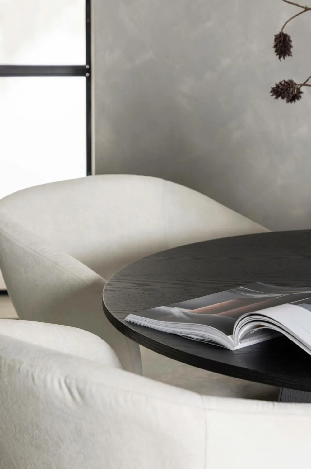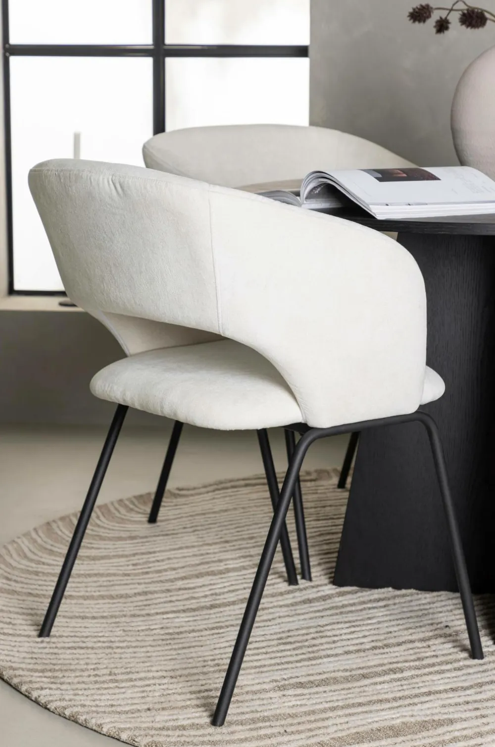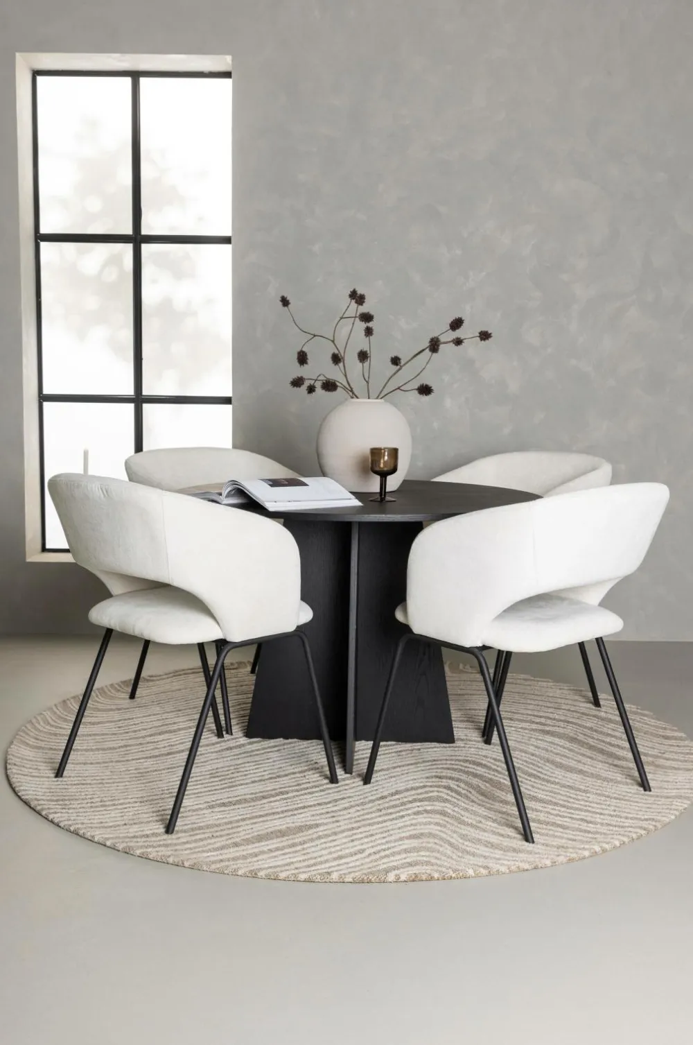 Her er Bootcut-bordet kombineret med venture designs skønne spisestuestole fra Day-serien. Disse stole kombinerer gennemtænkt design, bløde former og en minimalistisk struktur for at skabe en perfekt siddeoplevelse. Med et fuldt polstret sæde og et åbent ryglæn tilbyder stolene Day enestående komfort, mens de udstråler en moderne og luksuriøs stil.