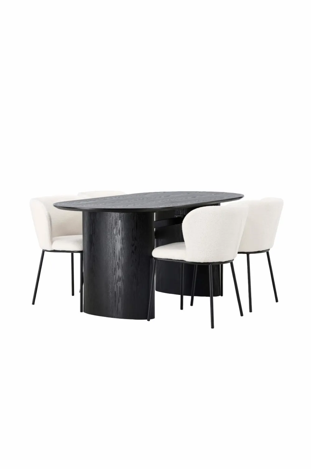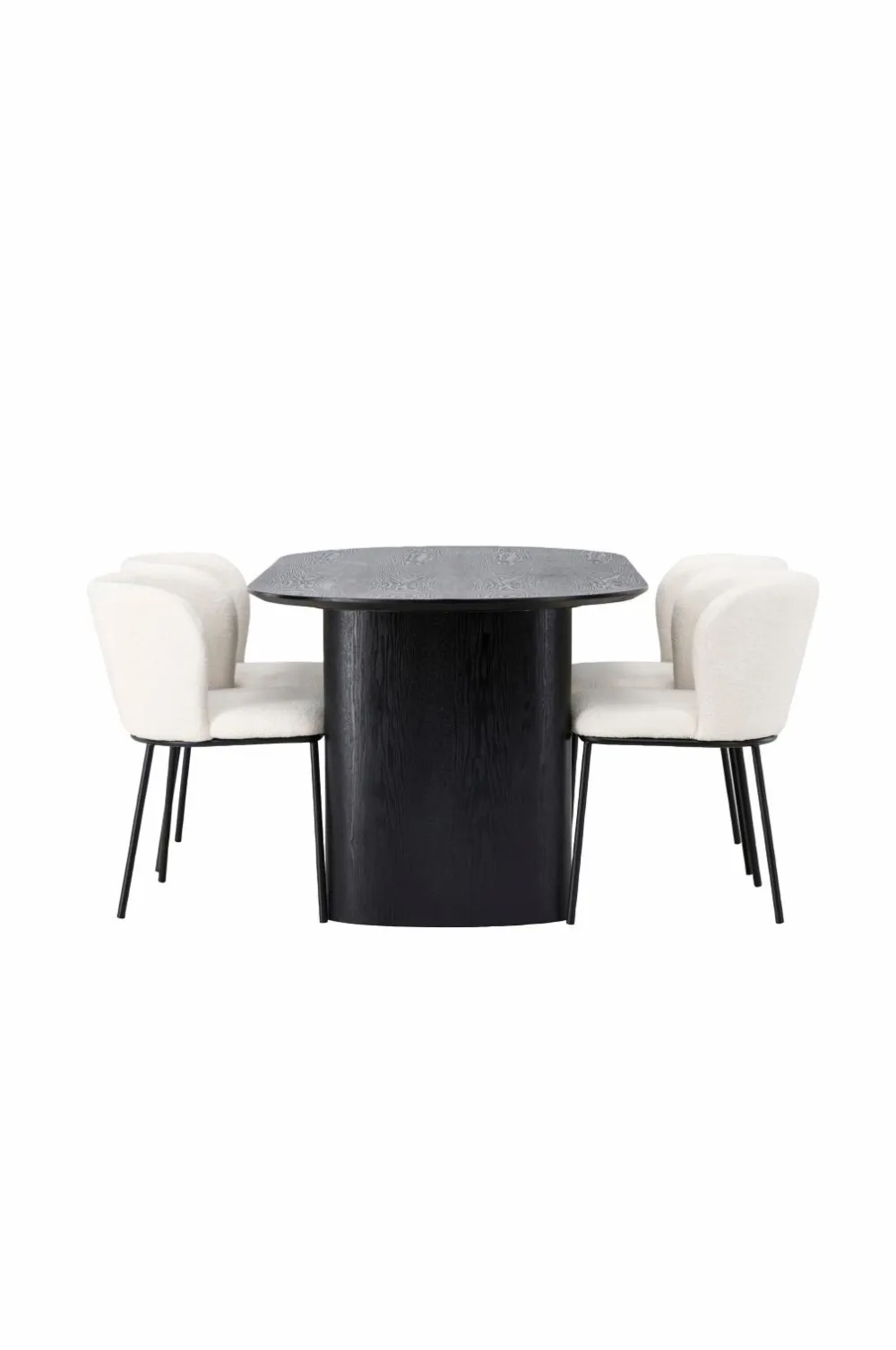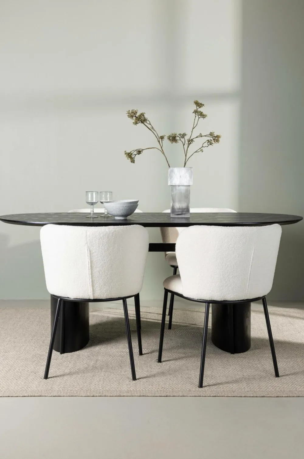 En fantastisk kombination af moderne former og bløde materialer! Det ovale spisebord Isolde i stilfuld farve har et moderne design med en oval bordplade i MDF og robust stel, der giver et solidt indtryk. Det levende materiale giver smagfuld bevægelse til blikfanget. Her i en vidunderlig kombination med stole fra Edina-serien. Stolen har et smidigt, fuldt betrukket sæde i boucléstof og minimalistiske stoleben i metal. Det stilfulde design og det behagelige sæde giver dig en komfortabel spisebordsstol, der holder tidens tand.