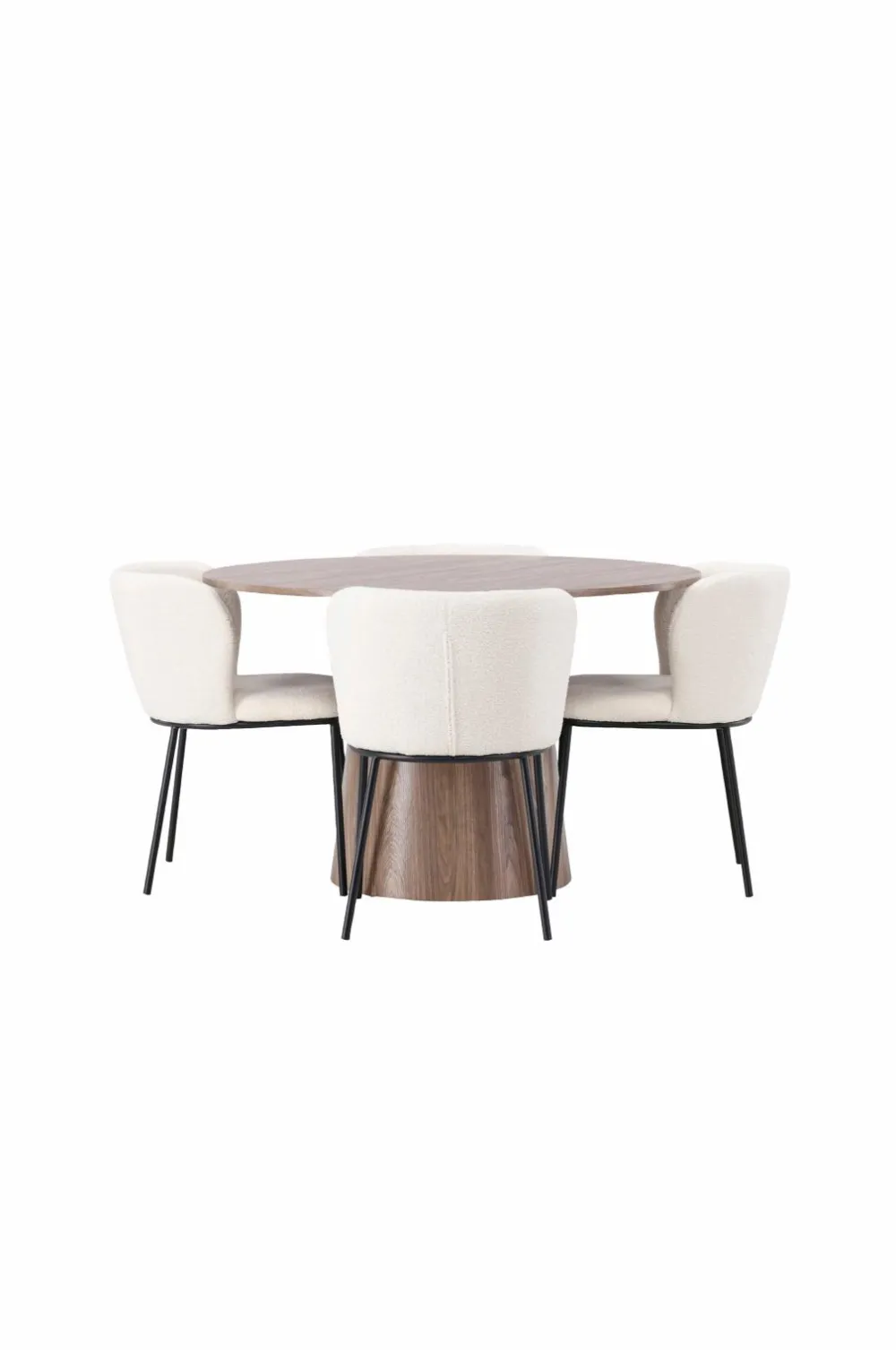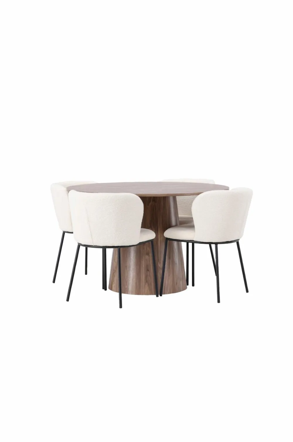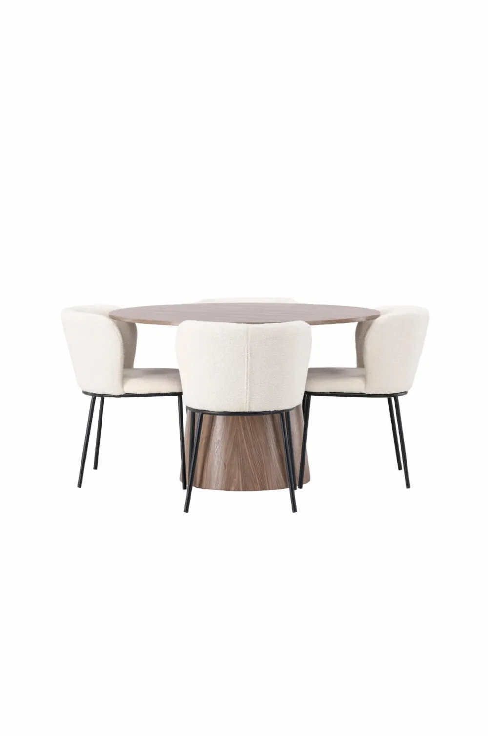 Det runde spisebord Lanzo i træ imponerer med sit skandinaviske design og smagfulde udformning. Med et gennemgående design lavet af MDF har dette spisebord en tynd, rund plade og et snoet cylinderformet stel, der er centreret under midten af bordet. Den jordnære farve fremhæver materialets smukke mønster og giver en følelse af naturlig elegance. Her er spisebordet matchet med spisebordsstole i bouclestof fra Edina-serien. Edina fanger virkelig de nyeste trends. Med et smidigt og fuldpolstret sæde i bouclestof og minimalistiske stoleben i metal, kombinerer denne spisebordsstol stilfuldt design med vidunderlig komfort.