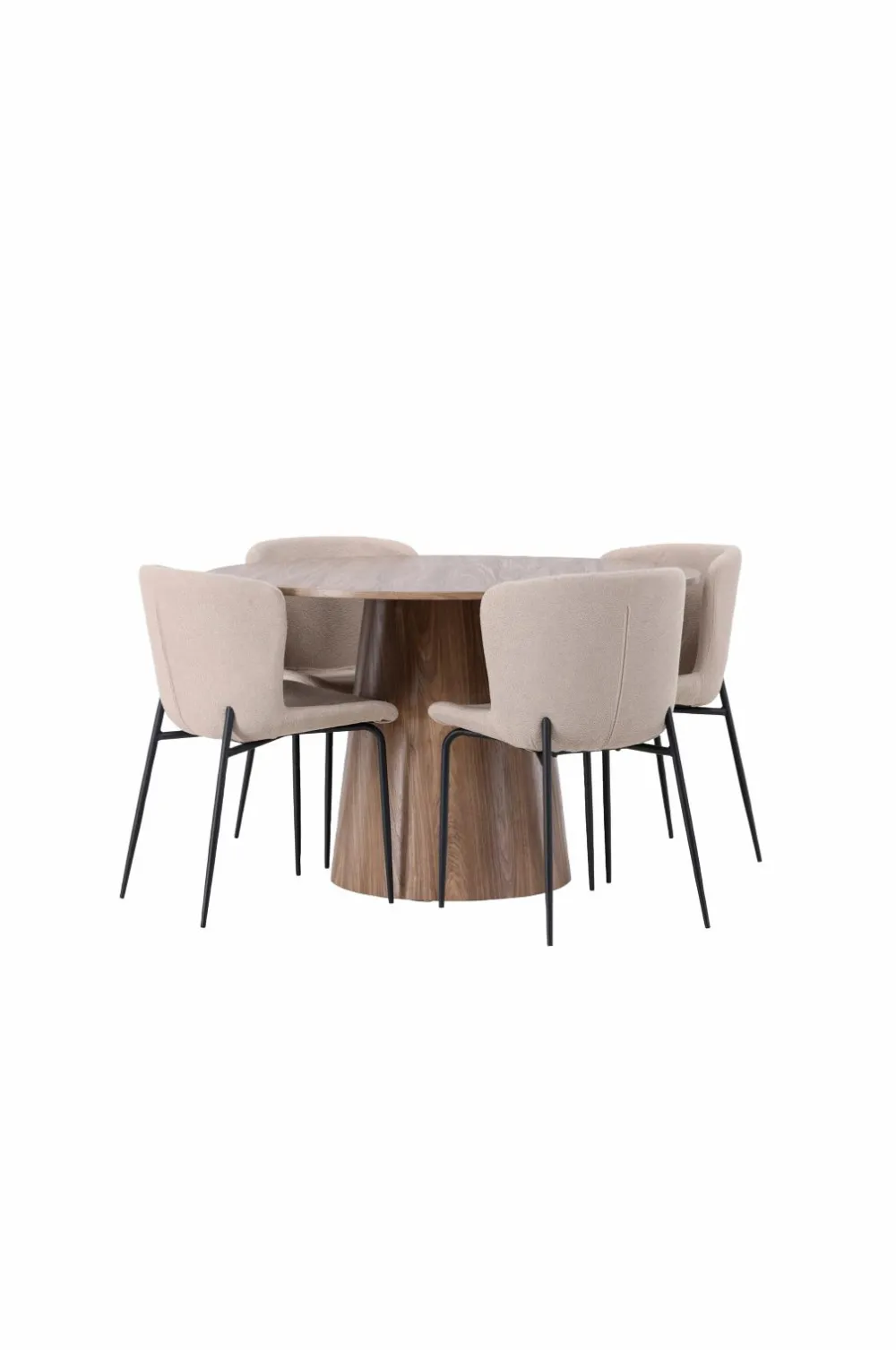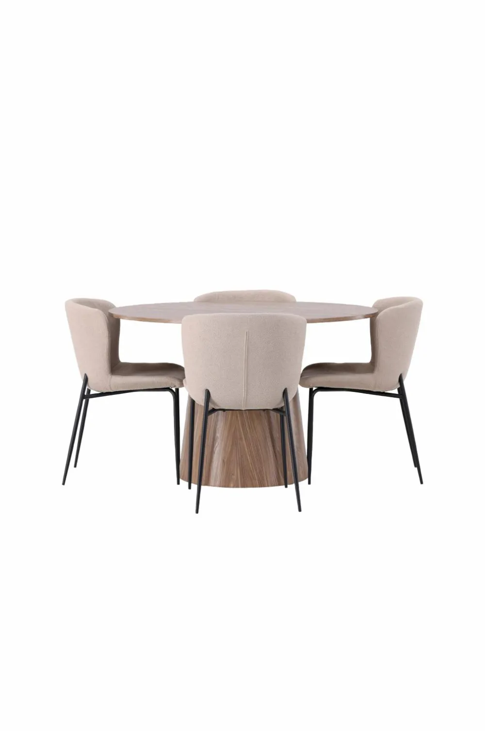 Jordnært og moderne! Venture Designs vidunderlige, runde spisebord Lanzo har et gennemgående helhedsdesign i MDF med en tynd bordplade og et snoet cylinderformet stel, der er centreret under midten af bordet. Farven er jordnær og gør materialets mønster synligt. Her sammen med trendy spisebordsstole fra serien Modesto. Stolen er fuldpolstret med lodnet stof med stilfulde smalle metalstoleben. Det let rundede ryglæn og den polstrede siddehynde giver ekstra komfort og forlænger hyggelige måltider omkring spisebordet. Slip for at vælge mellem stil og komfort!