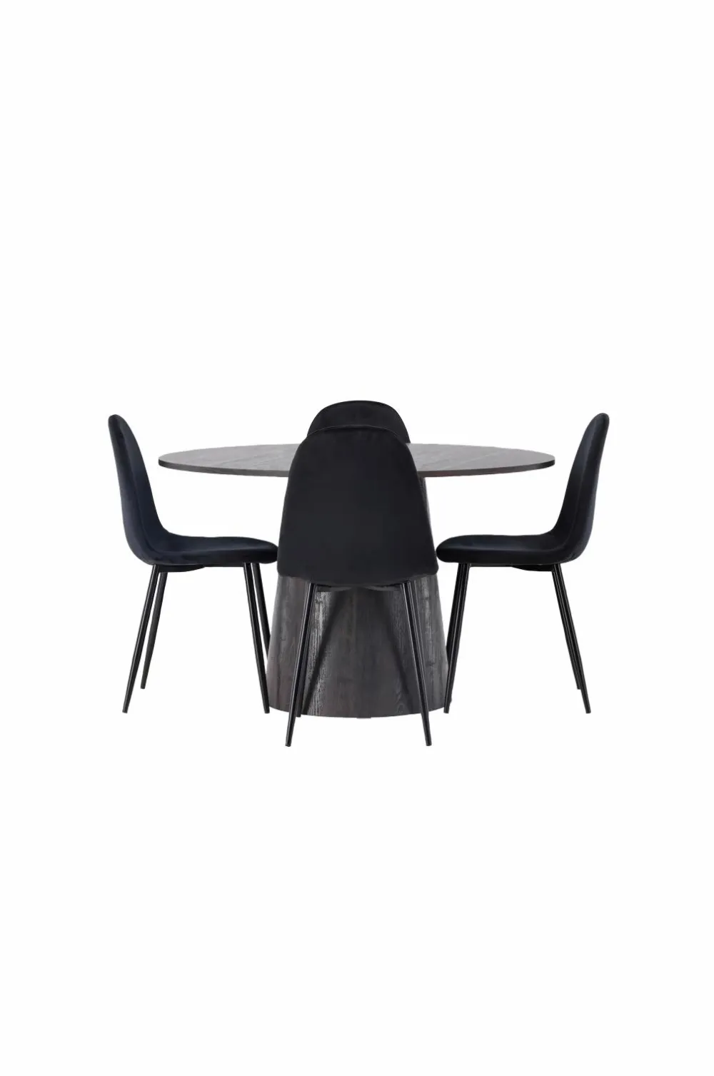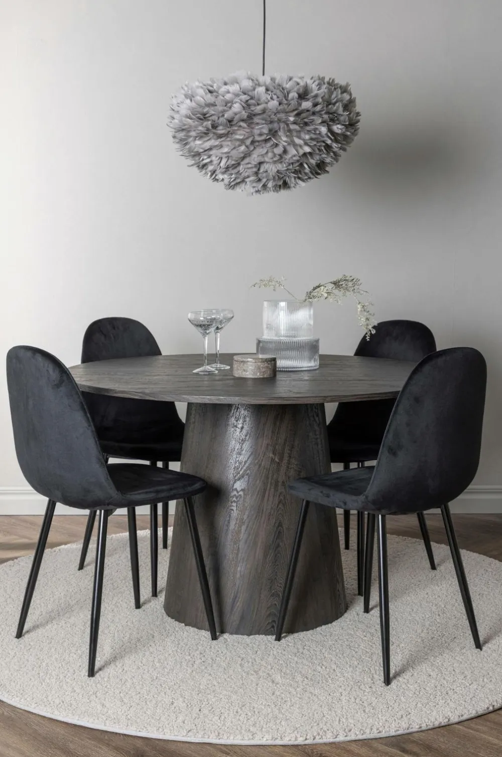 Her kommer ingen til at sidde ved kanten! Venture Designs vidunderlige, runde spisebord Lanzo har et gennemgående helhedsdesign i MDF med en tynd bordplade og et snoet cylinderformet stel, der er centreret under midten af bordet. Her i flot kombination med spisebordsstole fra serien Polar. Stolen har et fuldpolstret design, ben i pulverlakeret metal og afrundet ryg og sæde i velourstof med blød polstring. Saml dine kære til hyggelige måltider!
