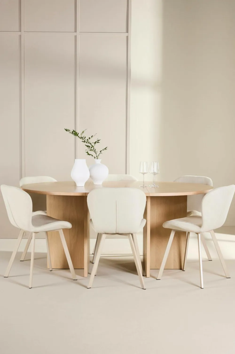 strada-spisebordet har den perfekte balance mellem funktionalitet og tidløst design. Bordet er fremstillet af finértræ af høj kvalitet og har et let og luftigt udseende, mens træets naturlige struktur tilføjer et strejf af subtil elegance. Med en diameter på 120 cm er bordet ideelt til hverdagens måltider, men det kan nemt udvides til 170 cm, så der er plads til flere gæster ved større sammenkomster. Stradas robuste konstruktion og materialer af høj kvalitet sikrer holdbarhed og pålidelighed i mange år fremover. Dets alsidige design gør det velegnet til alt fra intime middage til festlige fejringer, så det ubesværet kan blandes med forskellige indretningsstile.