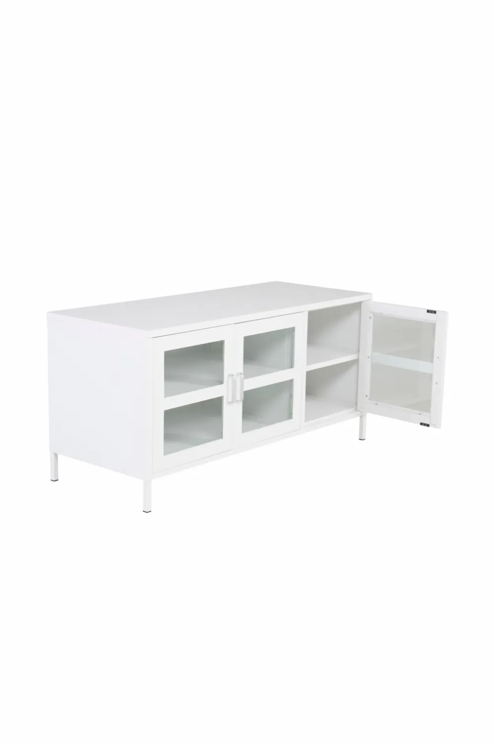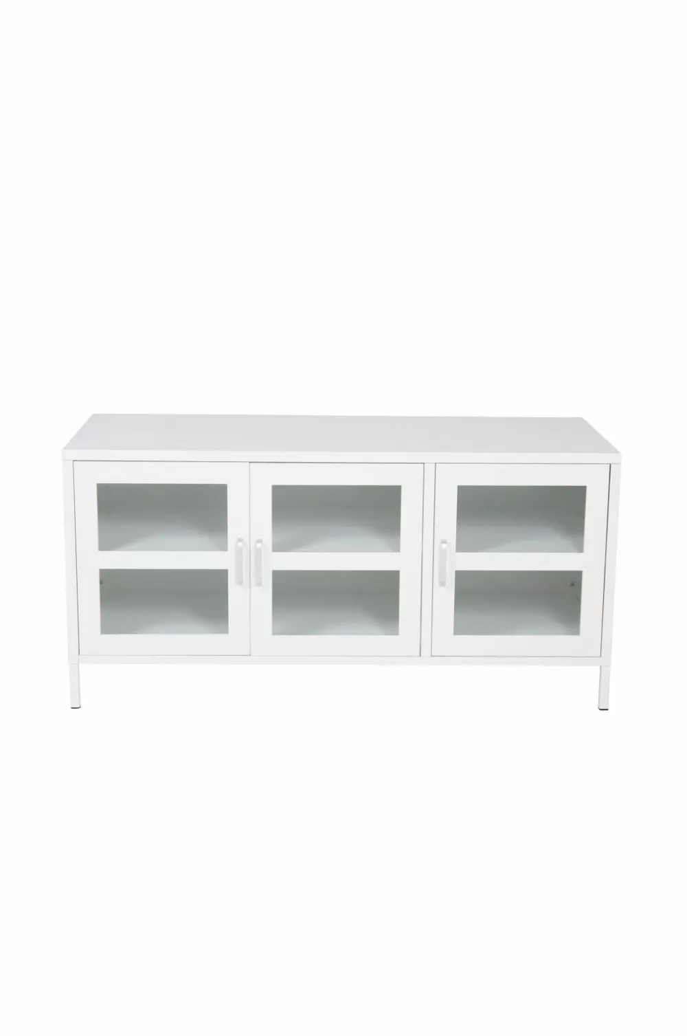 Aciel Tv-bænk i stål med tre glaslåger, som gør at du nemt kan se hvad du har i skabet, med fine sølvfarvede håndtag. 48 x 120, højde 58 cm. Leveres usamlet.