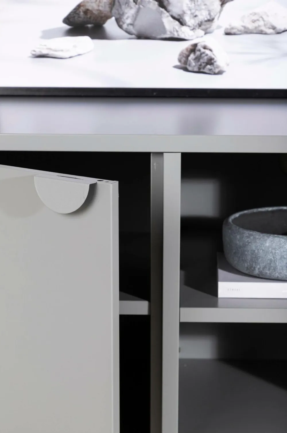 Den perfekte tv-bænk til det moderne og smarte hjem! Denne bænk fra serien Piring er fremstillet i hvid stål og har en praktisk dybde som giver masser af opbevaringsplads. Bænken har to hylder med to låger til skjult opbevaring og en midterdel med åben opbevaring – perfekt til stilrene detaljer såsom en moderne vase eller en bog. Designet er helt enkelt utrolig gennemtænkt og i tråd med trenden samt tidløst!