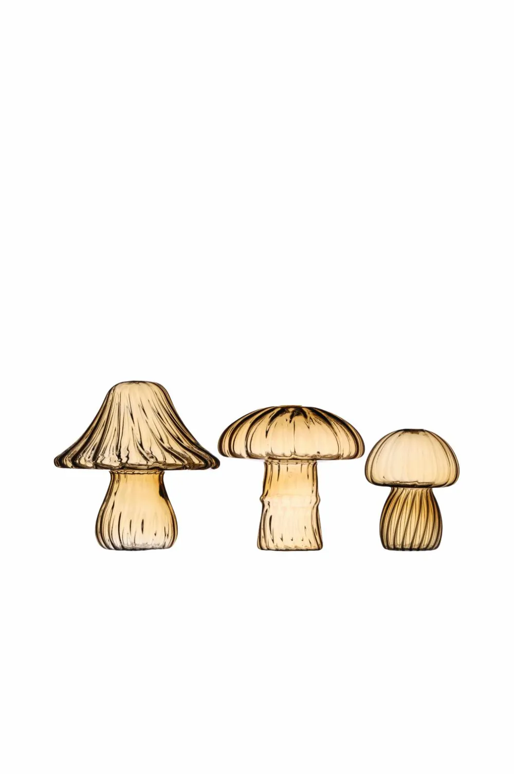 Dekorative svampe i gennemfarvet glas, sæt med tre. Mål: 15×15, 13×13, 9x10cm