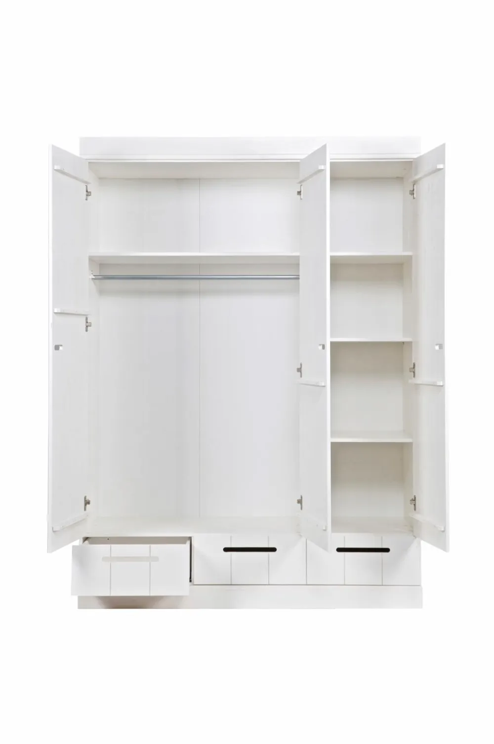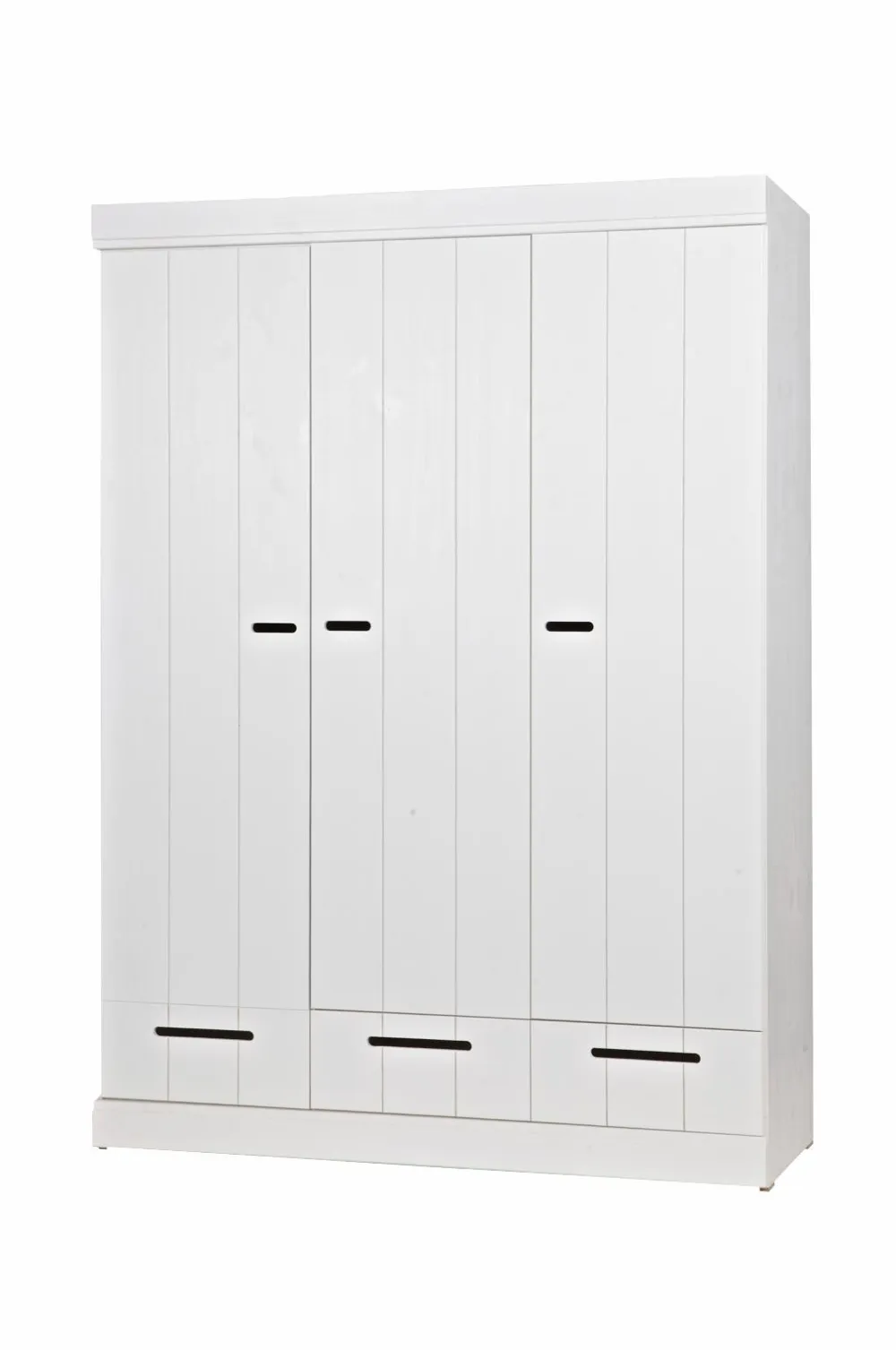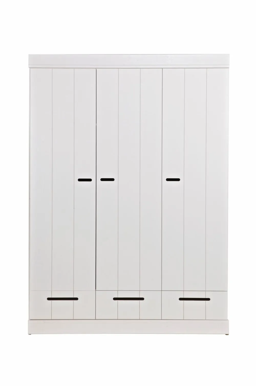 Fra CONNECT-serien; et robust garderobeskab med 3 låger og 3 praktiske skuffer (udstyret med robuste metalstyr til skufferne). Med CONNECT-skabet kan du bygge din egen skabsvæg! CONNECT-skabet er lavet i massiv fyrretræ. Indersiden er udstyret med laminerede hylder, praktiske at rengøre! Skabet er malet hvidt, men du kan også nemt male det i en anden farve (brug vandbaseret maling).
