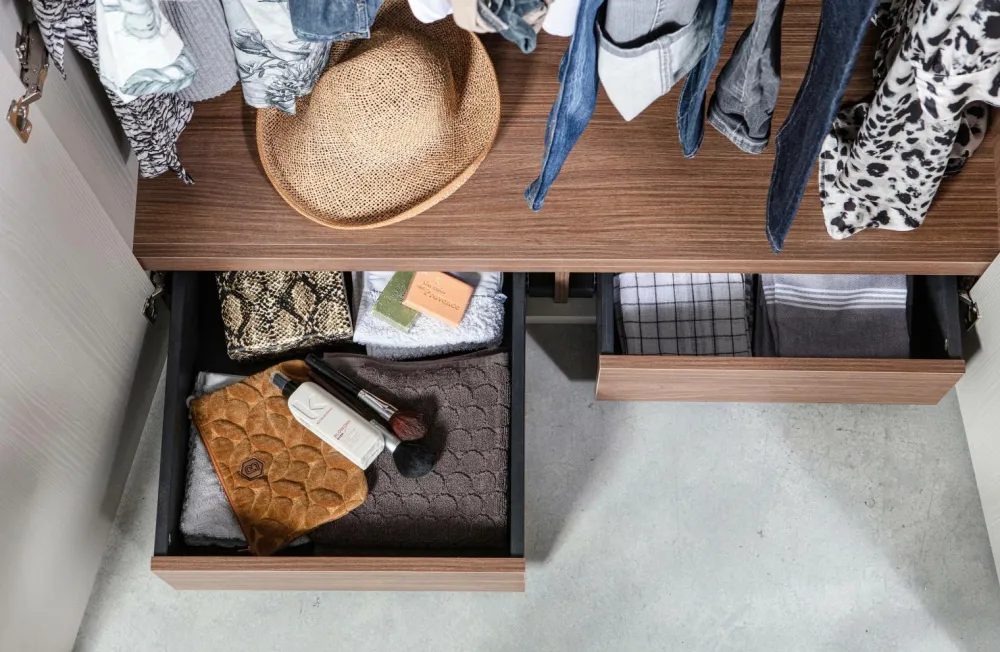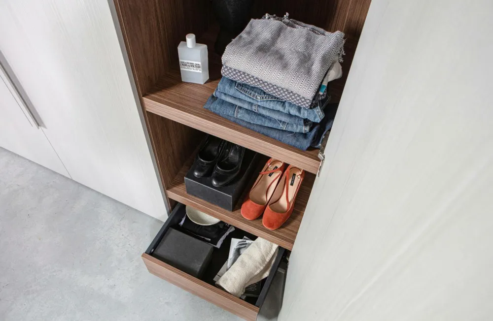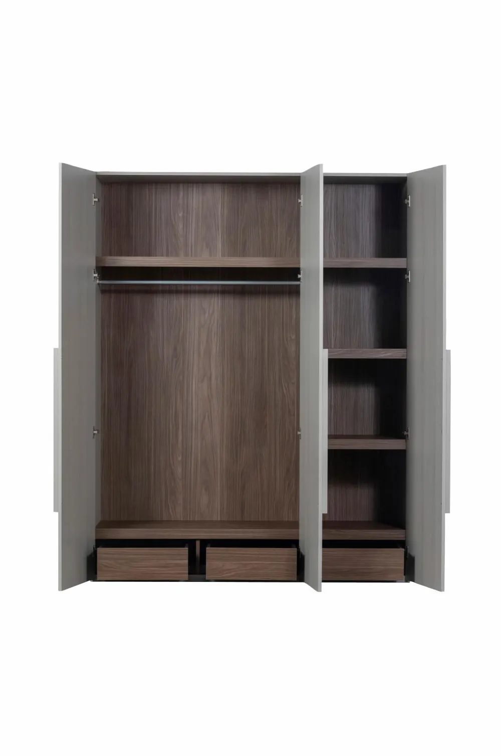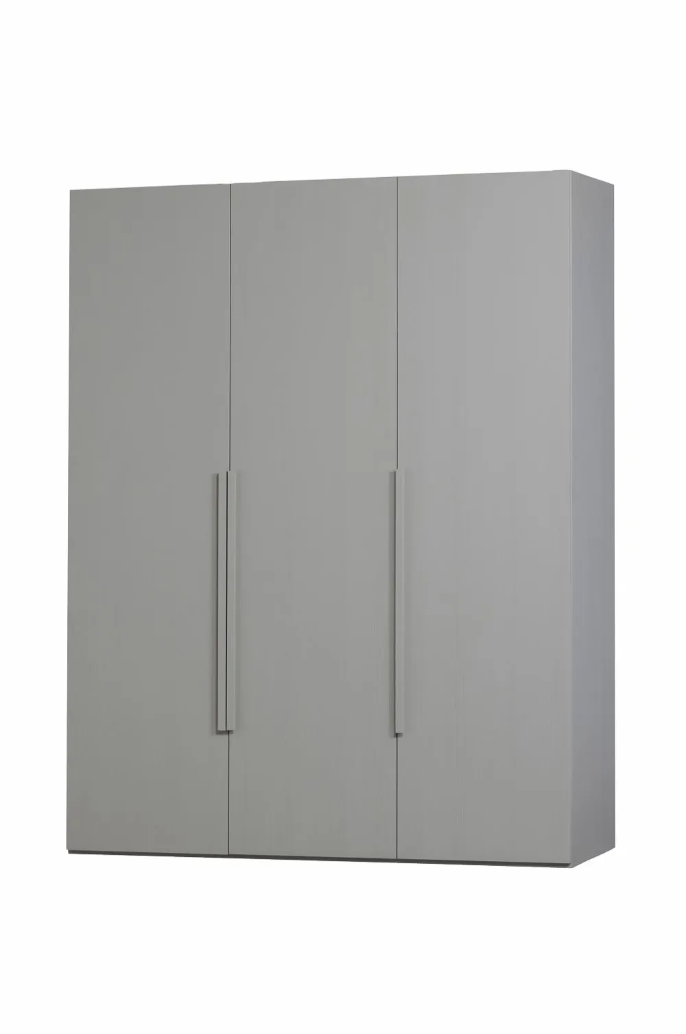 Garderobeskabet Rens med 3 låger er 210 cm højt, 165 cm bredt og 58 cm dybt. De fire åbne rum er 42 cm høje, 53 cm brede og 55 cm dybe. De tre skuffer har rulleskinner og har indvendige mål 13x43x48 cm (hxbxd). Den rummelige bøjlesektion er 155 cm høj og 108 cm bred. Træpladerne er 1,5 cm tykke.