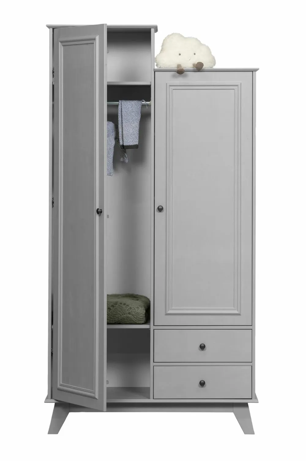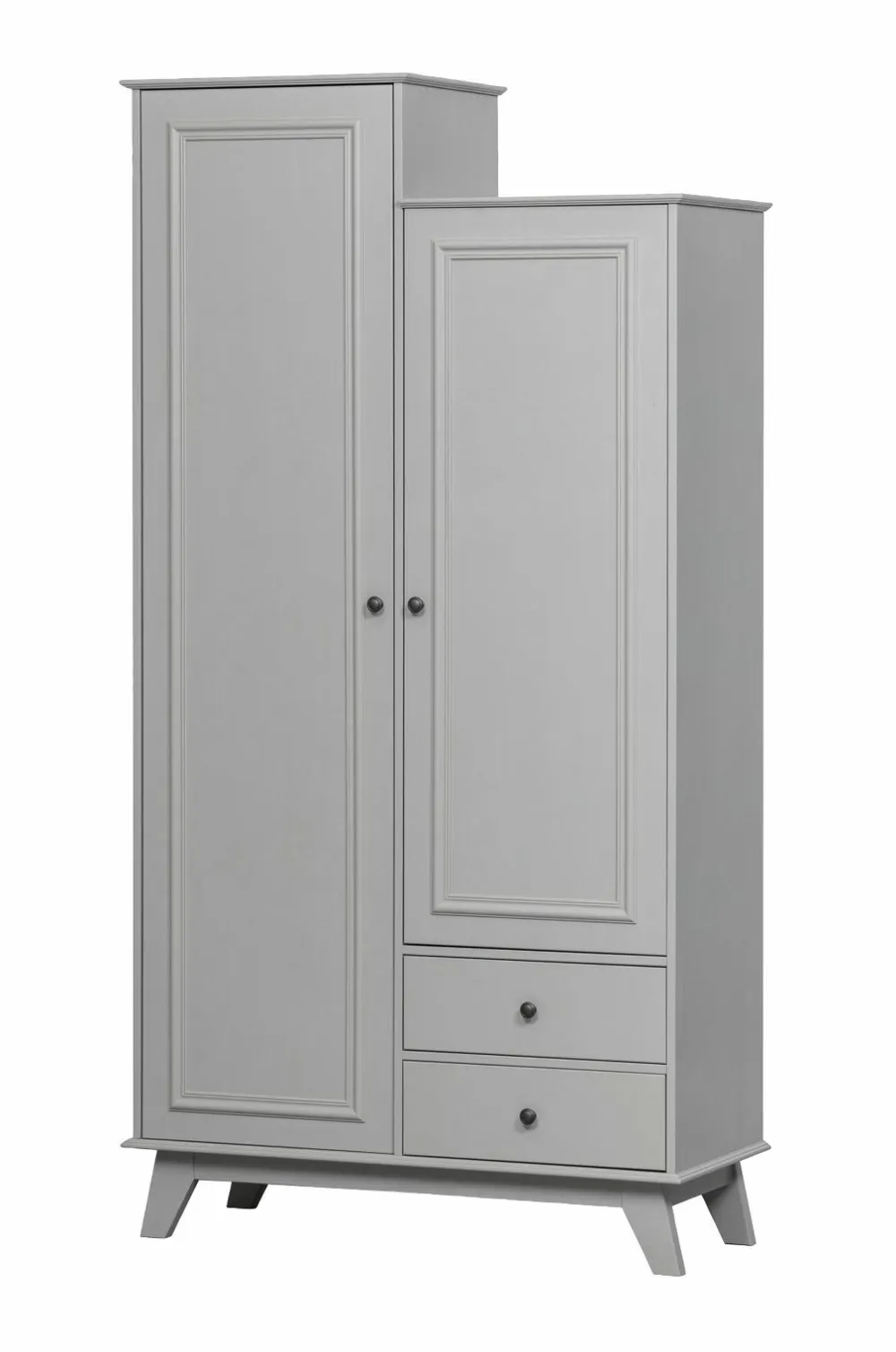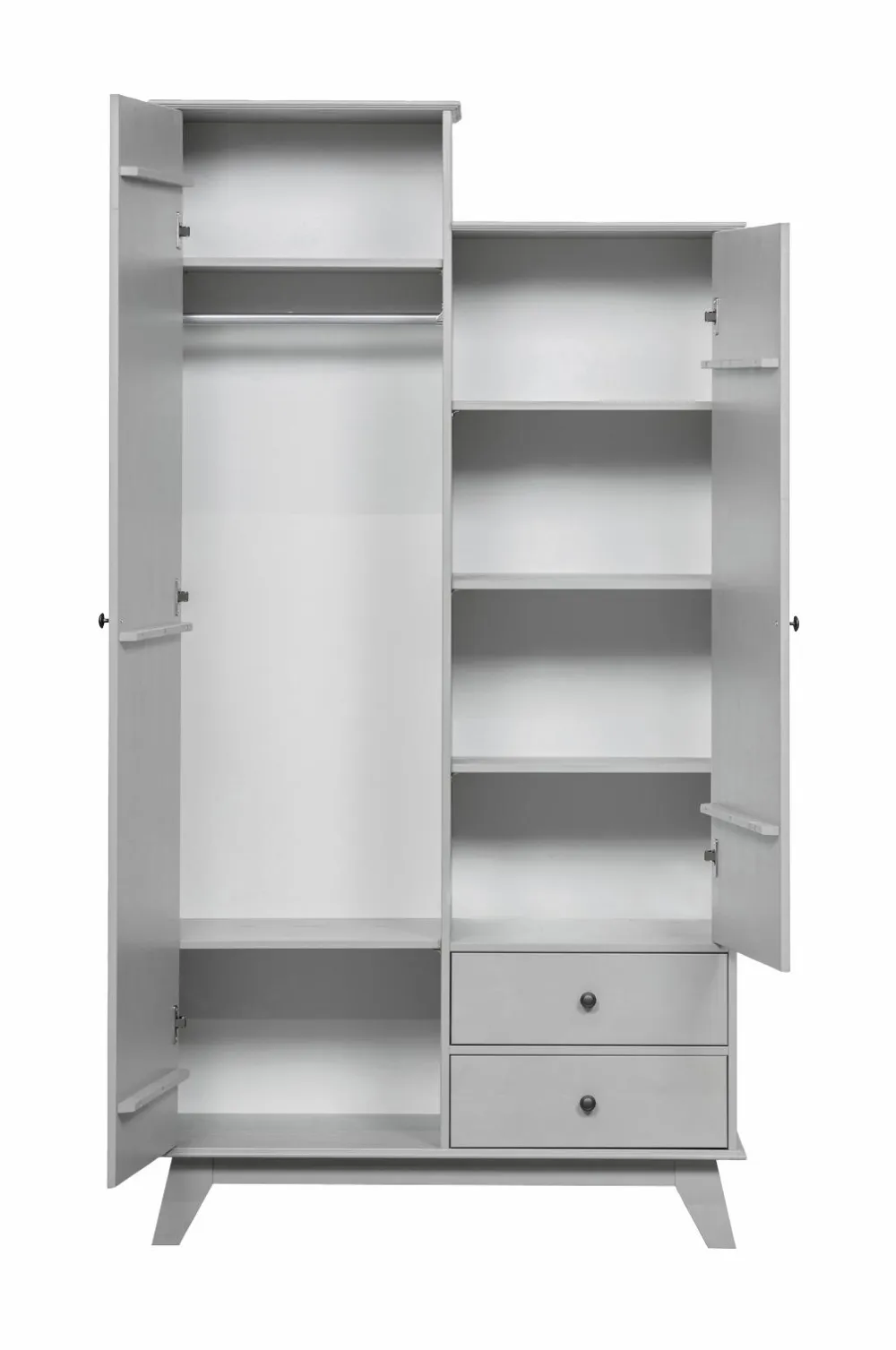 Lily garderobeskabet har et sjovt, asymmetrisk design, men med en klassisk stil. Lily er et eget design i en kollektion fra det hollandske mærke WOOOD. Skabet er fremstillet af fyrretræ med finish i varm, grå farve. Skabet har to skuffer med sort metalhåndtag og to låger med sorte metalhåndtag. Den asymmetriska højde giver Lily en spændende effekt, men den klassiska stile gør skabet tidløst.