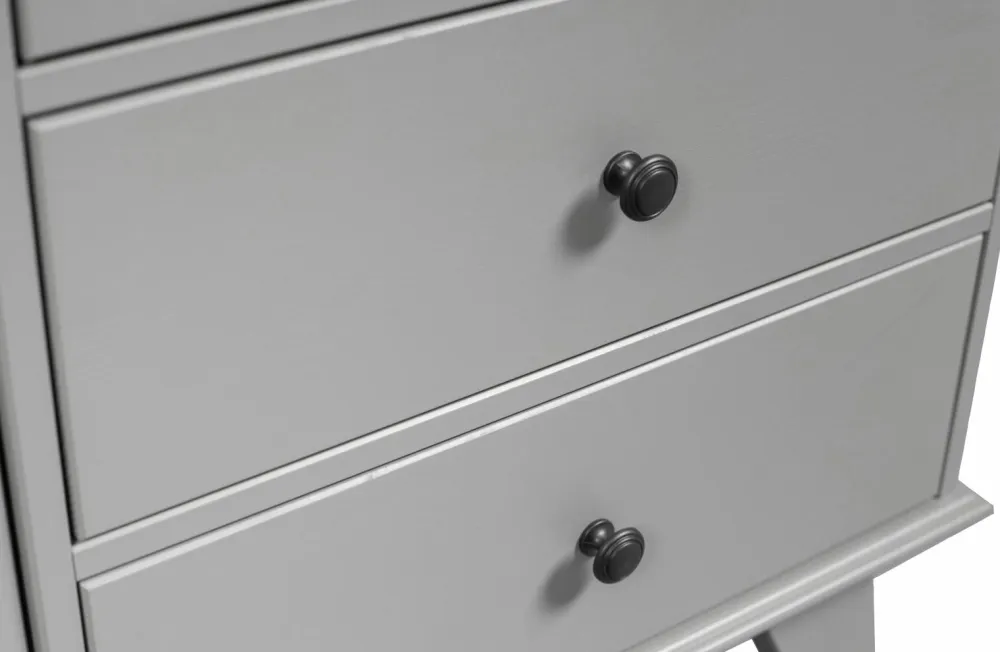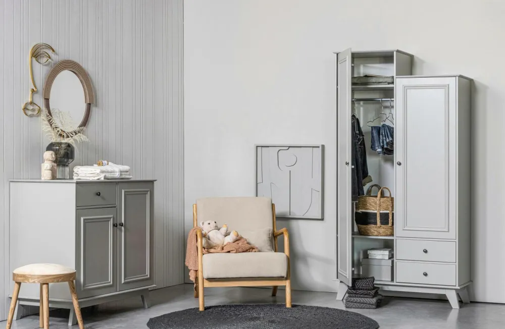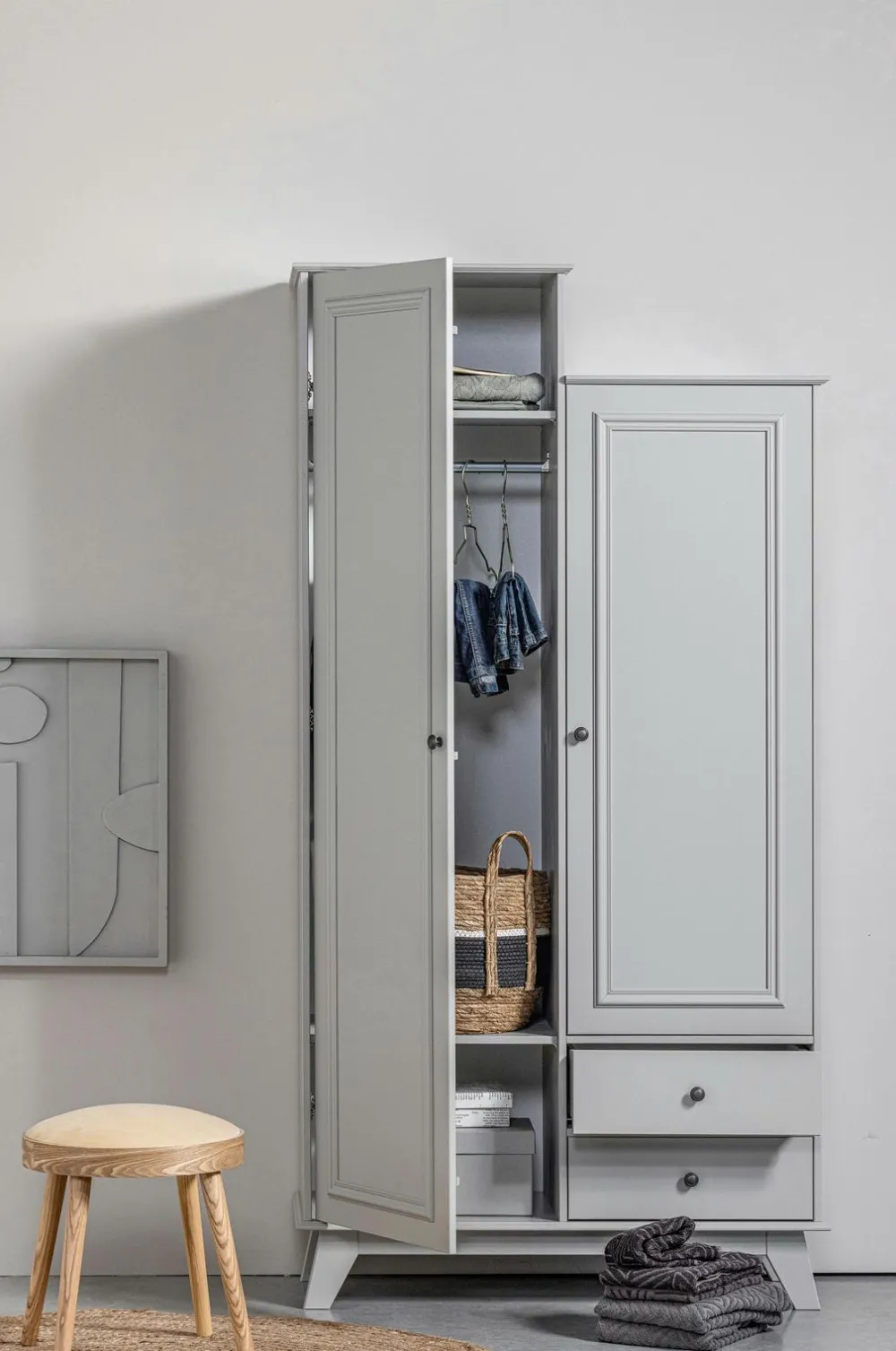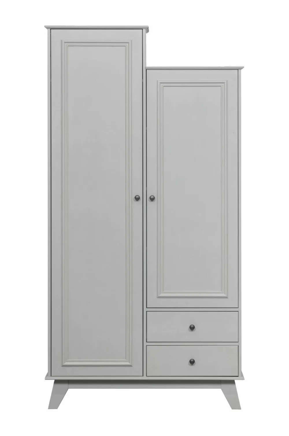 Lily garderobeskabet har et sjovt, asymmetrisk design, men med en klassisk stil. Lily er et eget design i en kollektion fra det hollandske mærke WOOOD. Skabet er fremstillet af fyrretræ med finish i varm, grå farve. Skabet har to skuffer med sort metalhåndtag og to låger med sorte metalhåndtag. Den asymmetriska højde giver Lily en spændende effekt, men den klassiska stile gør skabet tidløst.