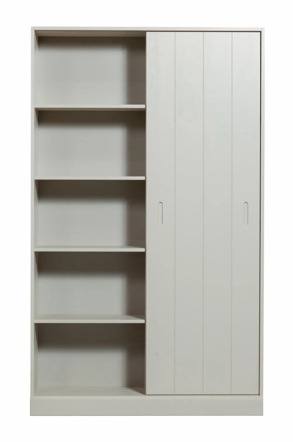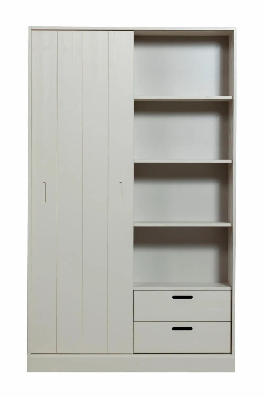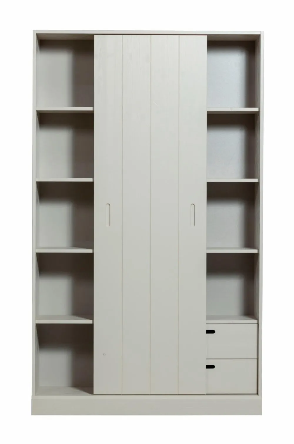 Et rummeligt skab med et trendy look og masser af opbevaringsplads. Træet har en slebet finish som giver skabet et ekstra råt udseende. Skabet har en bredde på 120 cm og har 9 store opbevaringsrum samt en praktisk skydelåge. Skydelågen sparer plads og gør det muligt at skjule nogle rum. I højre side af skabet er der yderligere to skuffer længst nede. Du kan vælge om du vil køre skydelågen hen foran skufferne eller om du vil kunne se de fine skuffer. Et skab som dette passer perfekt ind i et moderne interiør.