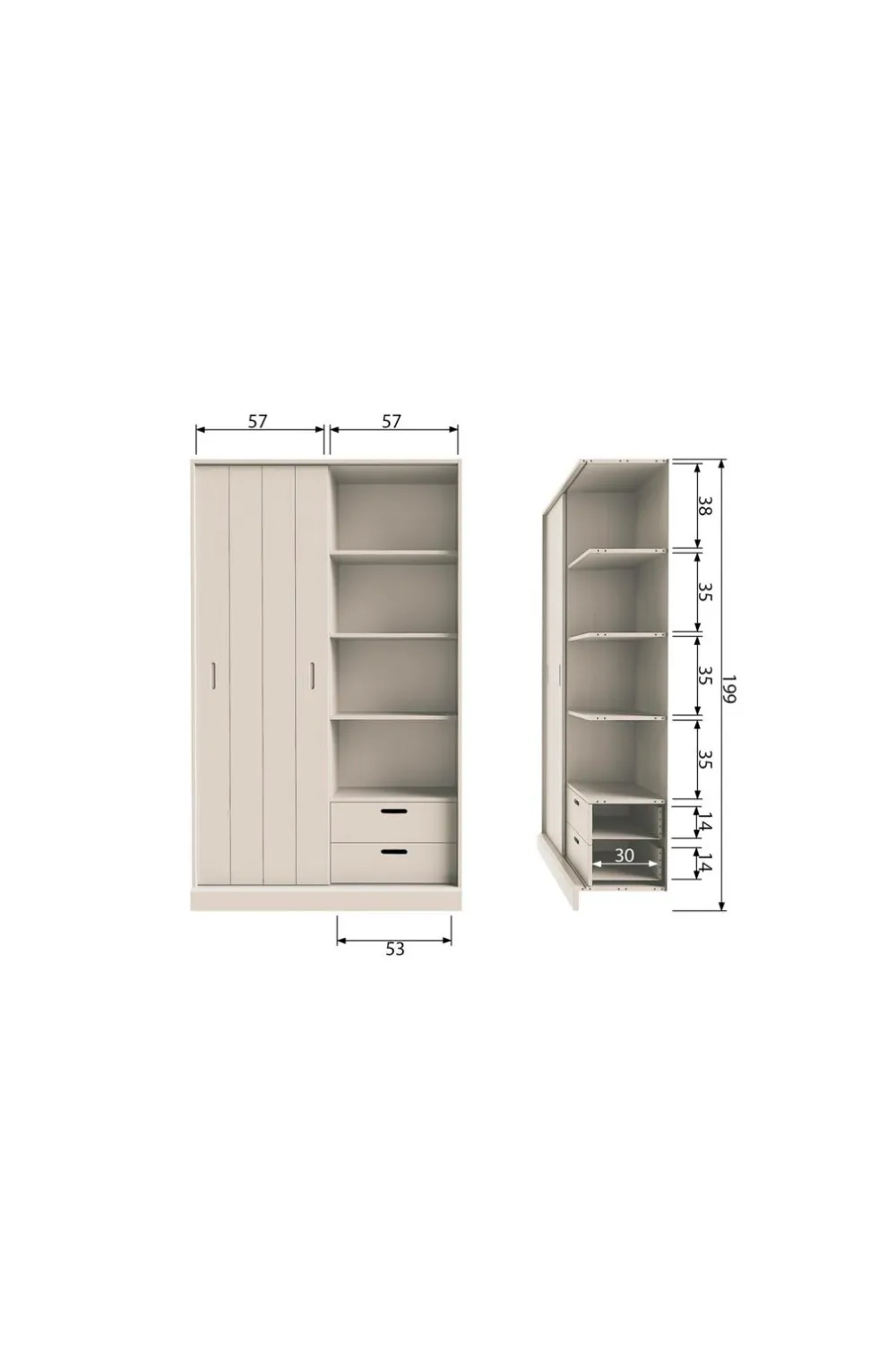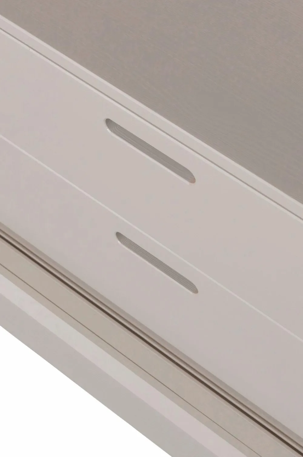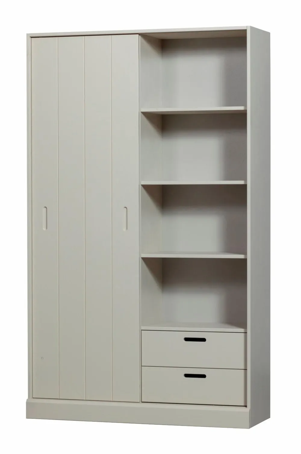 Et rummeligt skab med et trendy look og masser af opbevaringsplads. Træet har en slebet finish som giver skabet et ekstra råt udseende. Skabet har en bredde på 120 cm og har 9 store opbevaringsrum samt en praktisk skydelåge. Skydelågen sparer plads og gør det muligt at skjule nogle rum. I højre side af skabet er der yderligere to skuffer længst nede. Du kan vælge om du vil køre skydelågen hen foran skufferne eller om du vil kunne se de fine skuffer. Et skab som dette passer perfekt ind i et moderne interiør.