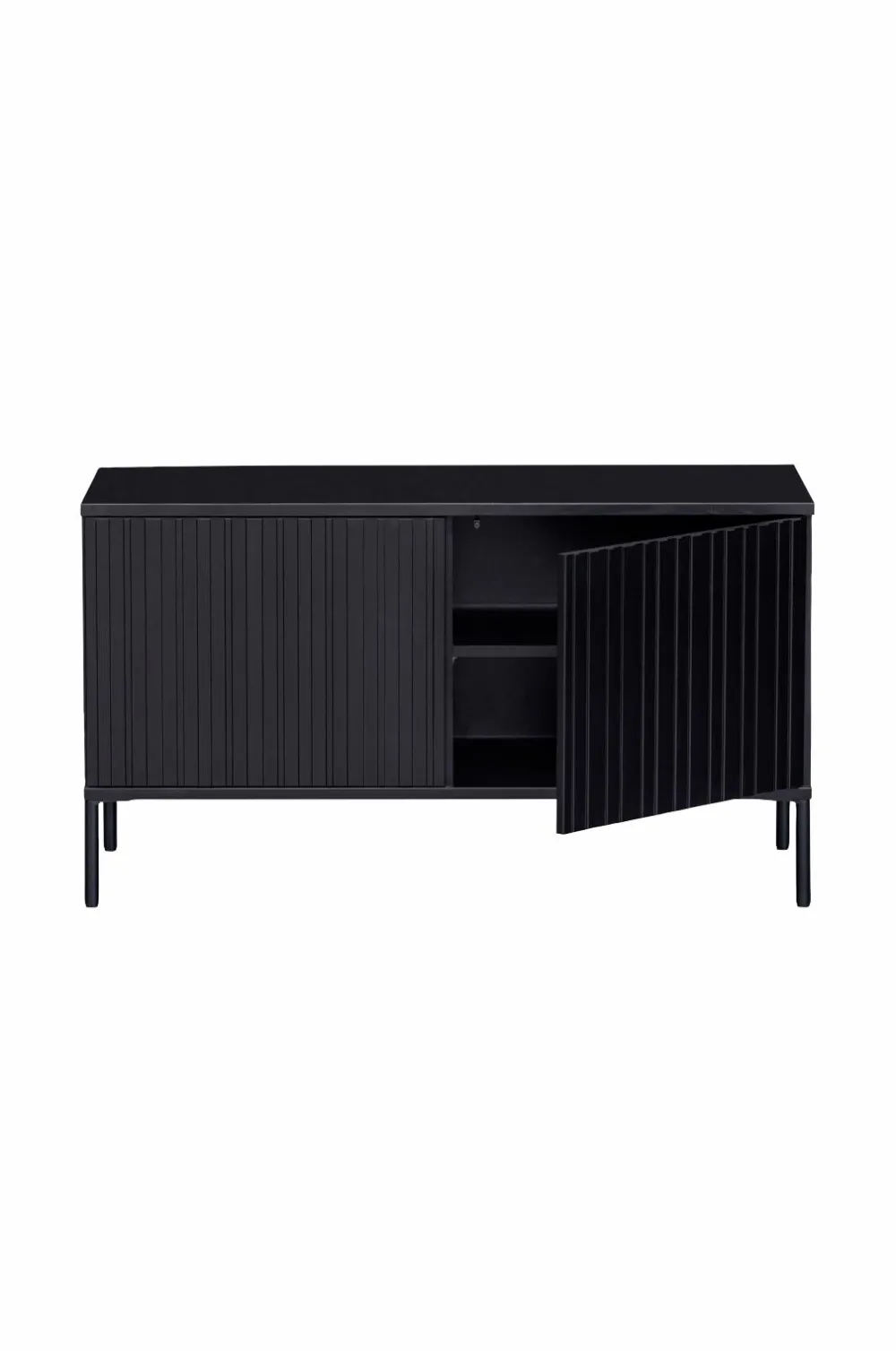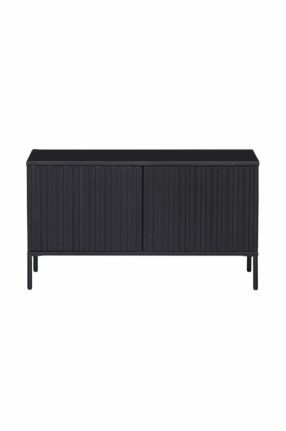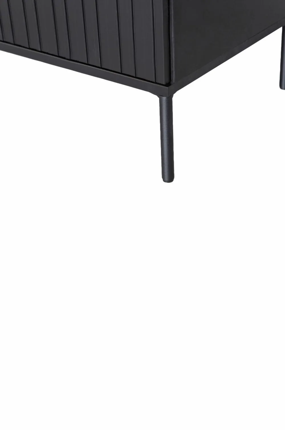 Vores populære kollektion Gravure i ny udgave! Gravure New tv-bænk er en del af kollektionen fra det hollandske indretningsmærke WOOOD og findes i to størrelser: bredde 100 cm og 150 cm. Gravure New tv-bænk er lavet af fyrretræ med finish i dyb, sort farve. Indersiden er lavet i sort spånplade. Benene er lavet i sortmalet metal. TV-bænken Gravure New har to låger med støjsvagt push-to-open-system og en praktisk skuffe.
