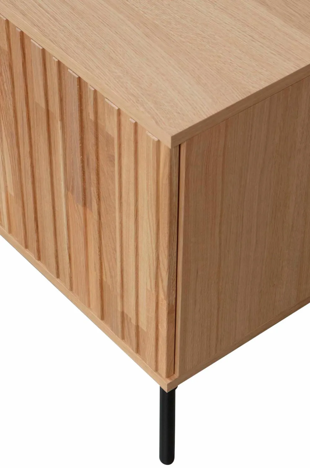 Vores populære kollektion Gravure i ny udgave! Gravure New tv-bænk er en del af kollektionen fra det hollandske indretningsmærke WOOOD og findes i to størrelser: bredde 100 cm og 150 cm. Gravure New tv-bænk er lavet af egefiner med transparent finish. Indersiden er lavet af spånplade i grå farve. Benene er lavet i sortmalet metal. TV-bænken Gravure New har to låger med støjsvagt push-to-open-system og en praktisk skuffe.